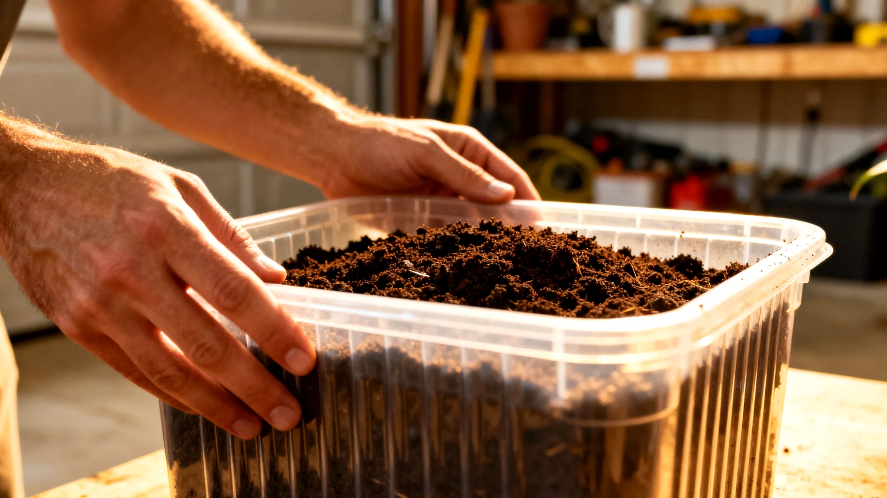 Utilizzare il coperchio dei secchi come vassoio da riempimento evita di sporcare il pavimento e facilita il rinvaso dentro casa. Valutare contenitori quadri piuttosto che cilindrici: occupano meno spazio e si “tassellano” perfettamente anche in ripostigli stretti. I contenitori quadrati eliminano gli spazi morti tra un contenitore e l’altro, massimizzando l’efficienza volumetrica e riducendo sia il disordine che gli sprechi accidentali di terra.